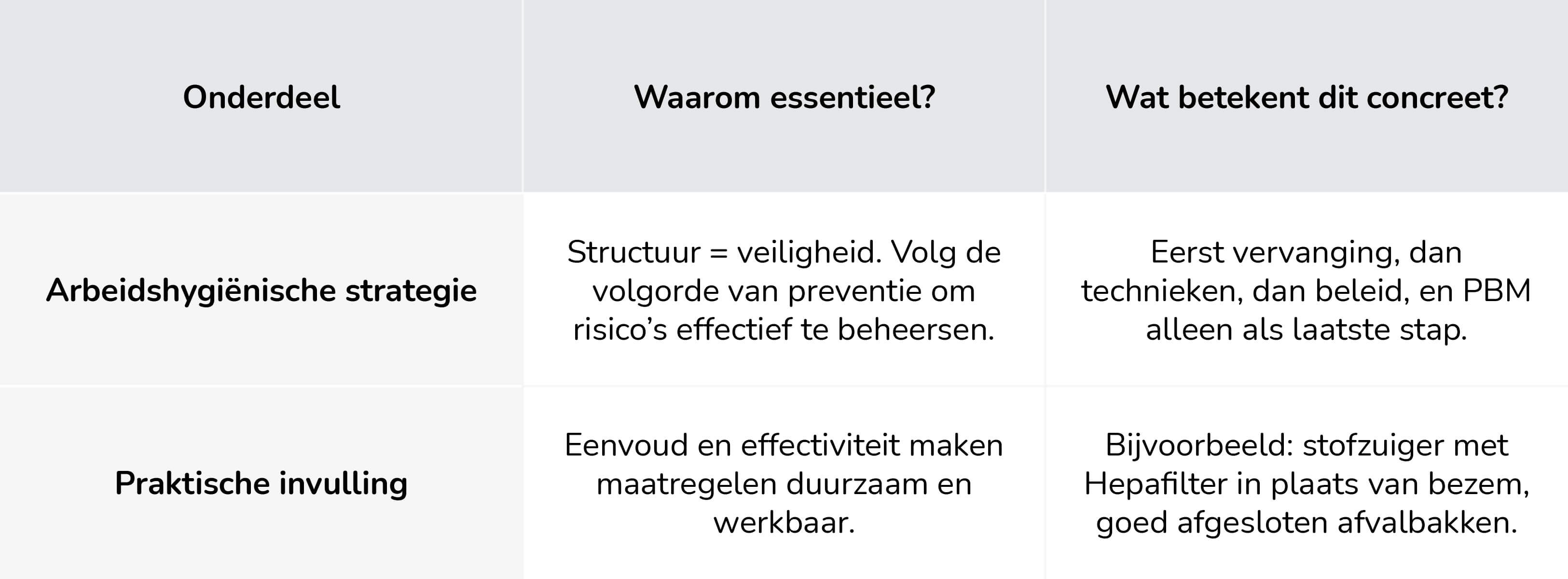 Om te weten welke maatregelen je dient te nemen hanteert de Arbeidsinspectie de arbeidshygiënische strategie. Dit is een vaste volgorde van maatregelen, ook wel de STOP-strategie genoemd: